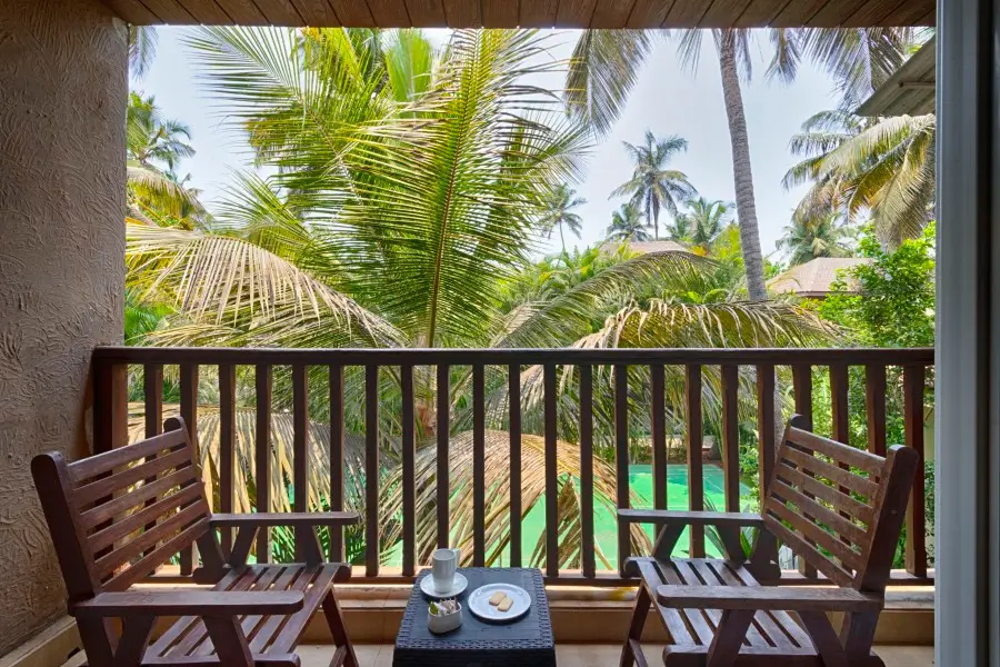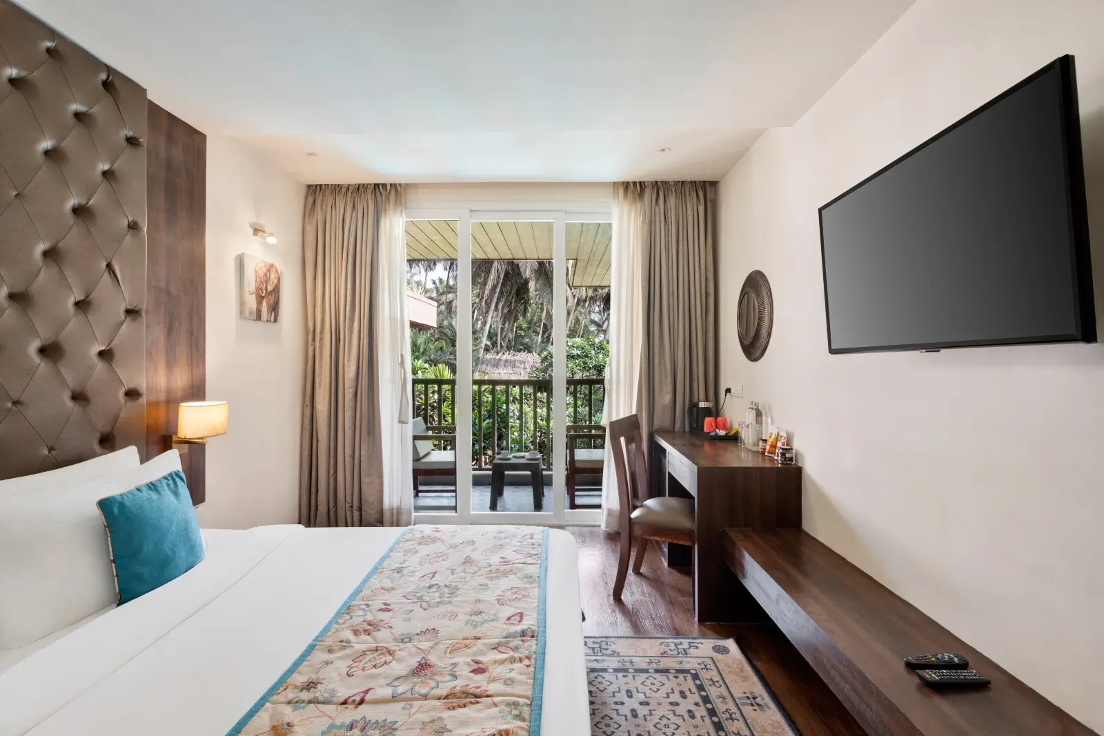 Step onto your private balcony and immerse yourself in poolside living, with turquoise waters framed by palms and sun loungers. Whether spent as family time or a couple’s escape, the experience stays effortlessly elevated — a hallmark of refined living at the finest hotel rooms in Mandrem North Goa.